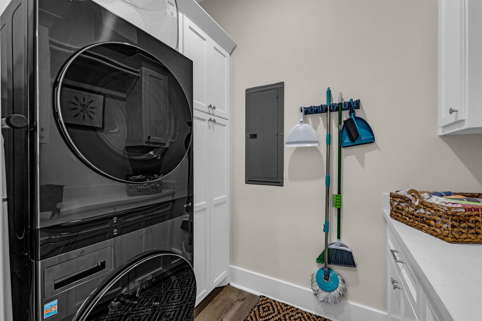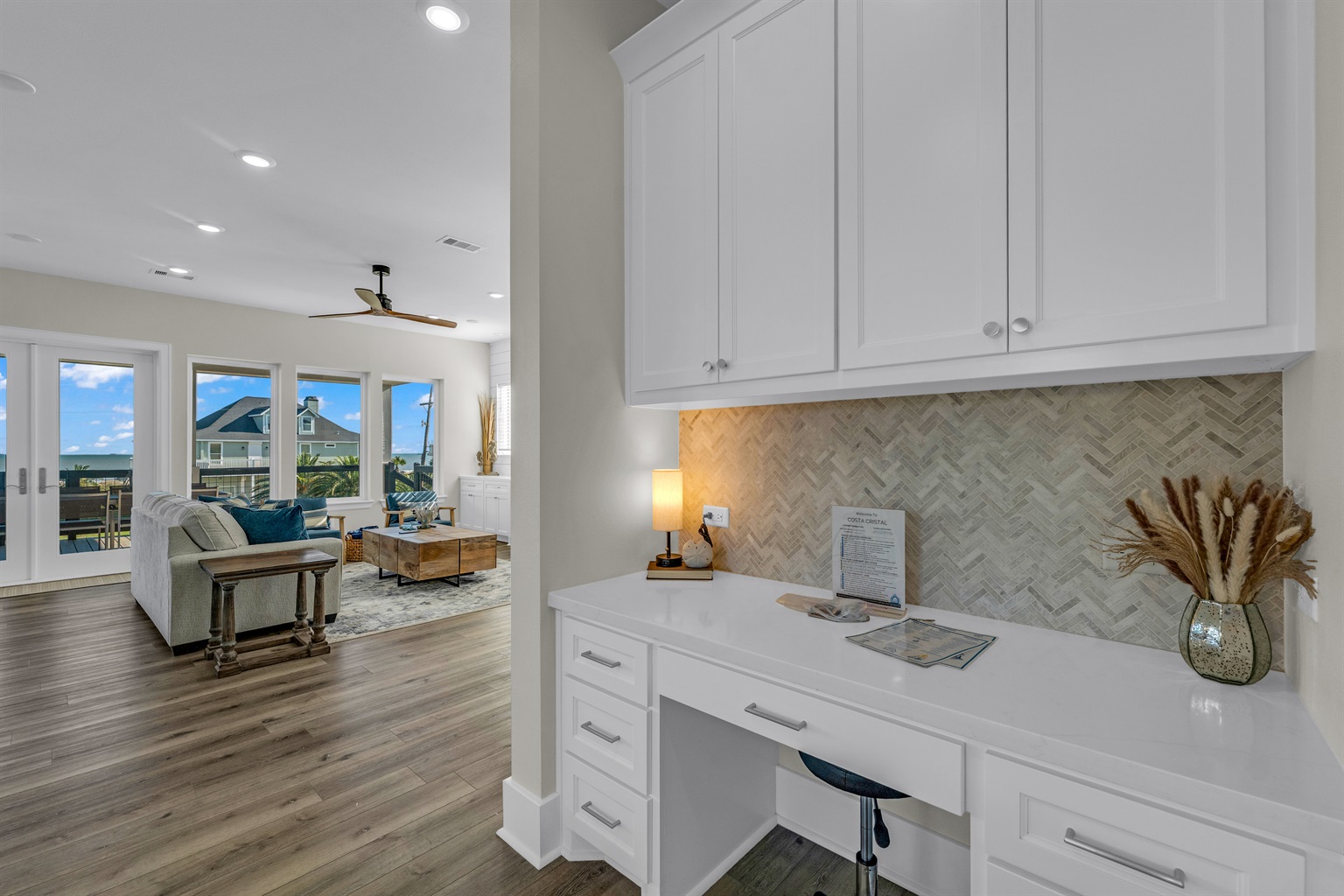 • Built in desk for working remotely with stool, located on main floor in kitchen area