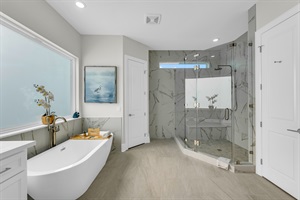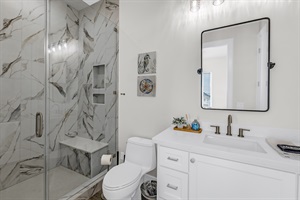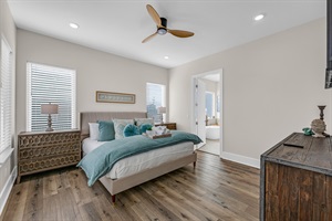 • Bedroom 1 (Primary First Floor): Sleeps 2, king bed, smart tv, deck access, private en-suite and extra-large closet.