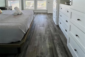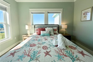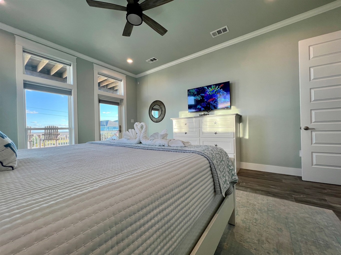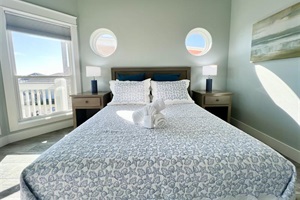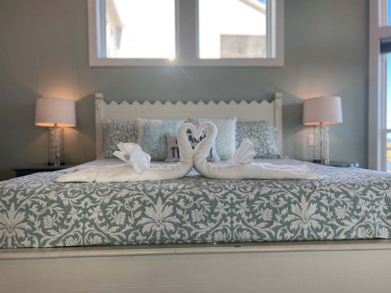 • Bedroom 1 (Primary First Floor): Sleeps 2, king bed, smart tv, deck access, en-suite & closet.