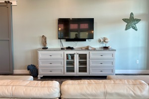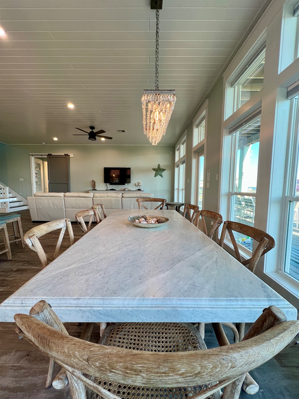 Enjoy the expansive comfort of our living room, boasting picturesque views of the Gulf Coast. Embrace sunsets and sunrises over the ocean creating a serene start or end to your day. Ample space is available for friends and family to gather, whether it's for engaging in indoor games or enjoying a movie night on our Smart TV w/ streaming. Cozy up with provided blankets for an added layer of warmth and relaxation. Need more space to entertain, enjoy our media room space on second floor w/ wet bar, beverage fridge, smart TV, seating and access to the second floor viewing deck.