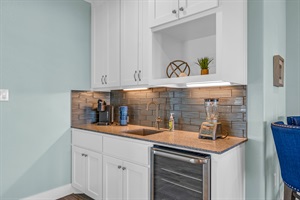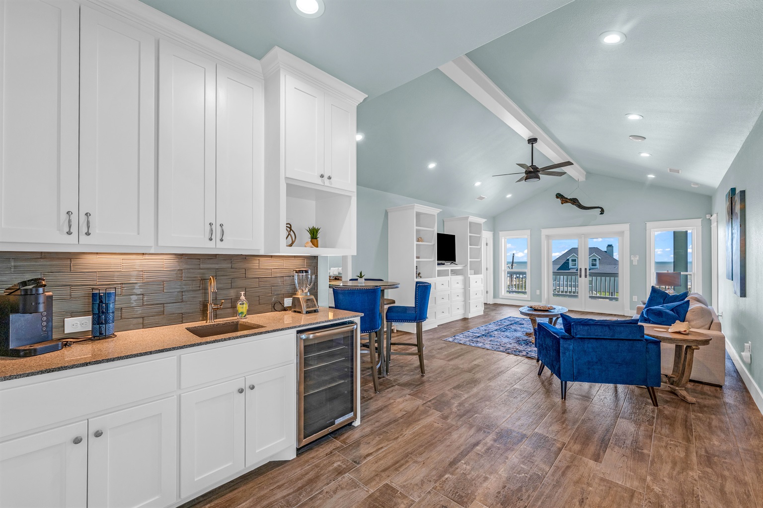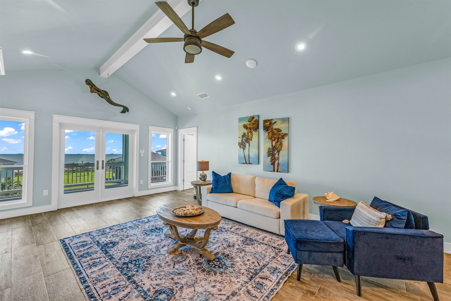 Enjoy the expansive comfort of our living room, boasting picturesque views of the Gulf Coast. Embrace sunsets and sunrises over the ocean creating a serene start or end to your day. Ample space is available for friends and family to gather, whether it's for engaging in indoor games or enjoying a movie night on our Smart TV w/ streaming. Cozy up with provided blankets for an added layer of warmth and relaxation. Need more space to entertain, enjoy our media room space on second floor w/ wet bar, beverage fridge, smart TV, seating and access to the second floor viewing deck.