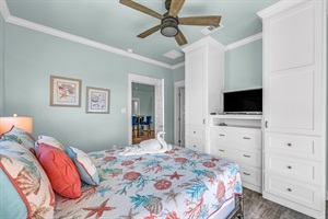 • Bedroom 4 (Second Floor): Sleeps 2, queen bed, w/ custom built in storage cabinets/drawers, smart tv and a jack n jill ensuite that services bedrooms 4 & 5 (bunk room)