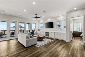 Enjoy the expansive comfort of our living room, boasting picturesque views of the Gulf Coast. Embrace sunsets and sunrises over the ocean creating a serene start or end to your day. Ample space is available for friends and family to gather, whether it's for engaging in indoor games or enjoying a movie night on our Smart TV w/ streaming. Cozy up with provided blankets for an added layer of warmth and relaxation. Need more space to entertain, enjoy our media room space on second floor w/ wet bar, beverage fridge, smart TV, seating and access to the second floor viewing deck.
